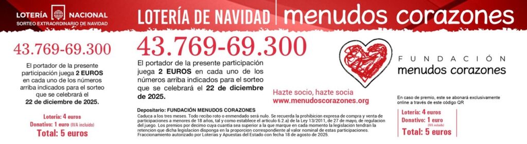 Ya tenemos disponible la Lotería Solidaria de Menudos Corazones. Es una manera de colaborar con la Fundación probando suerte en el Sorteo Extraordinario de Navidad.
