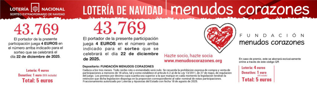 Este año, también ofrecemos la posibilidad de que participes en nuestra lotería comprando papeletas de manera online del número 43.769. Es una forma muy cómoda de apoyarnos y probar suerte. Se juegan 4 € al Nº 43.769 y se da una aportación a Menudos Corazones de 1 € de donativo. Total: 5 € por participación.