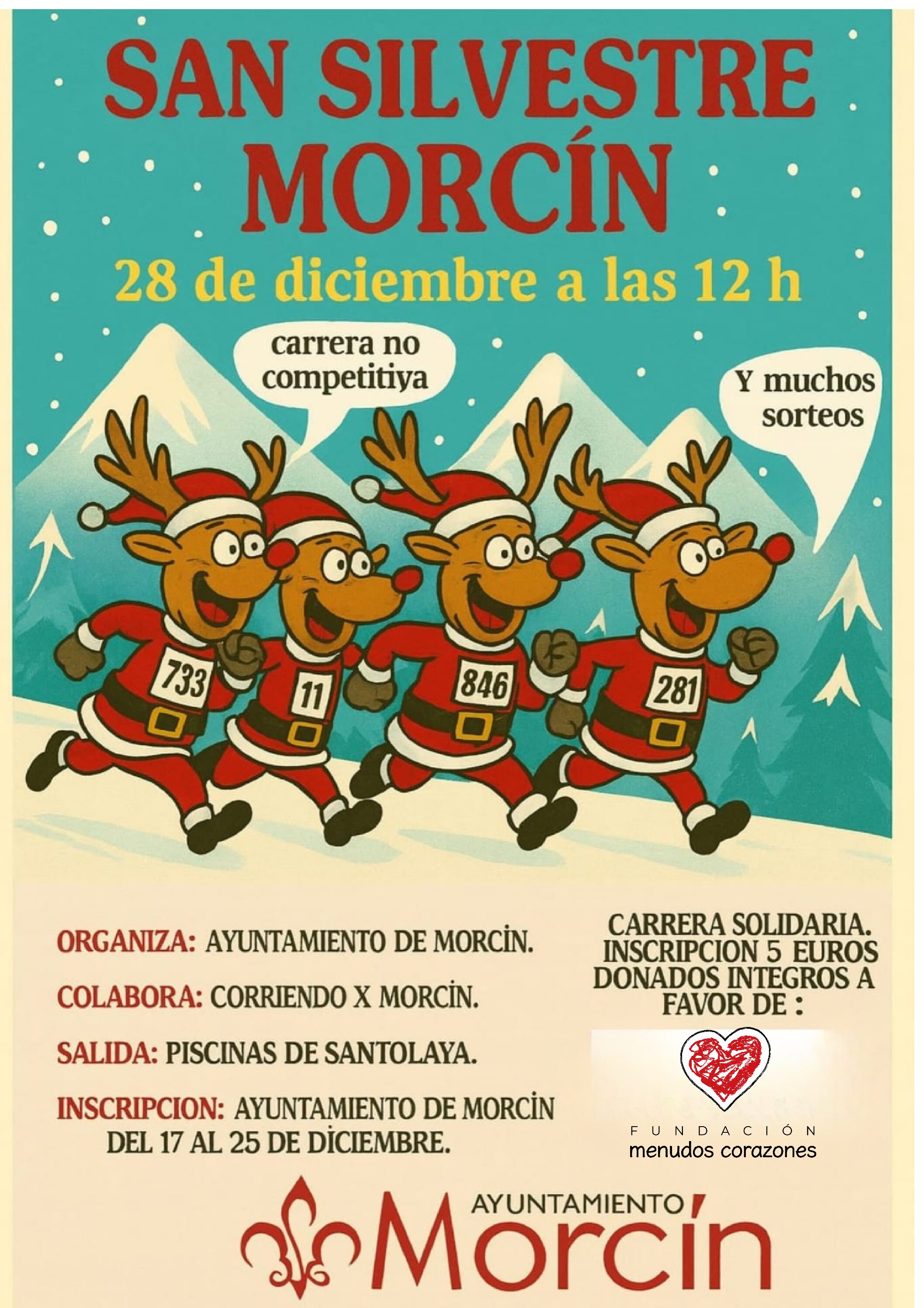 Las inscripciones, a 5 euros por persona, se destinarán íntegramente a favor de Menudos Corazones y se podrán realizar en el Ayuntamiento de Morcín, del 17 al 25 de diciembre, Av. de Mont-Sacro, 1, teléfono 985 78 33 11.